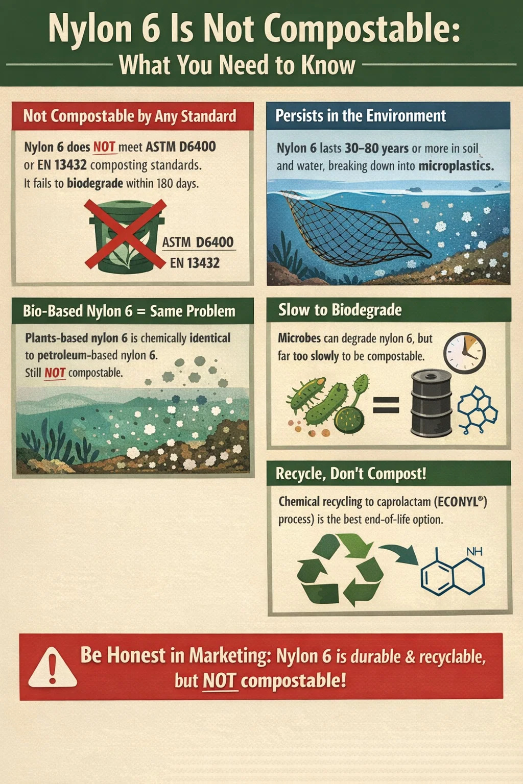 Se, että nylon 6 ei ole kompostoitava – ja että sen fyysinen hajoamisreitti johtaa mikromuovin saastumiseen puhtaan hajoamisen sijaan – on yksi keskeisistä ympäristön vastalauseista sen laajalle levinneelle kertakäyttöisissä tai lyhytikäisissä sovelluksissa.