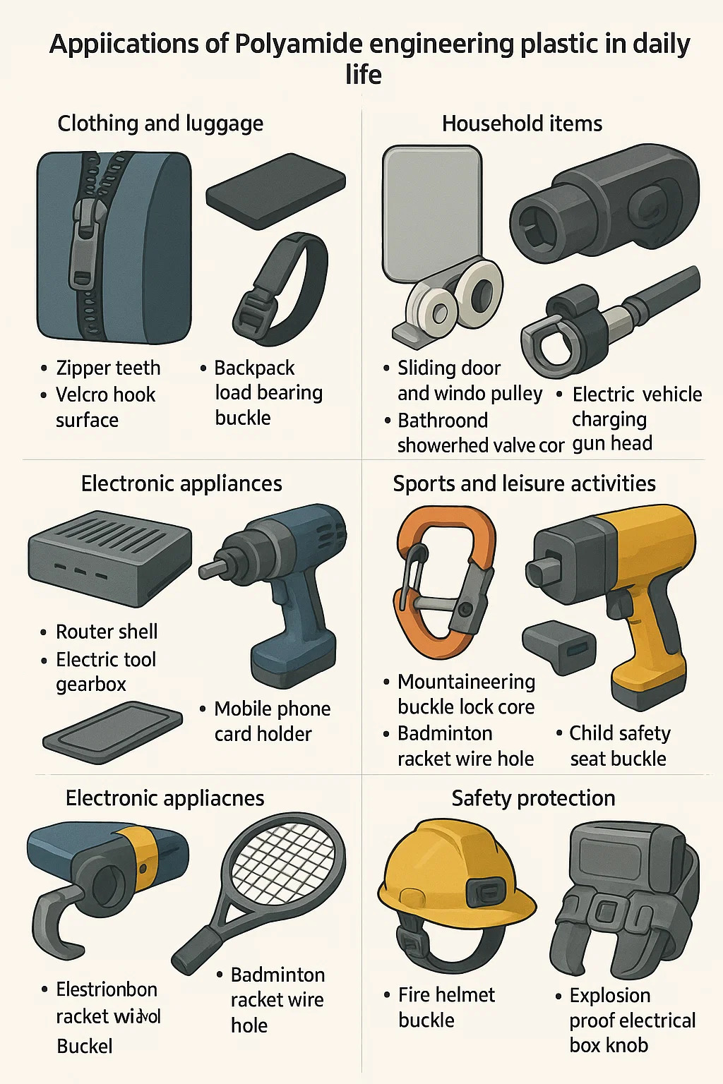 Soveltaminen teknillinen muovipolyamidi Jokapäiväisessä elämässä läpäisee useita kenttiä, ja sen perusarvo on ominaisuuksissa korvata teräs muovilla ja kevyt ja kestävä. Erityiset tyypilliset skenaariot ovat seuraavat: