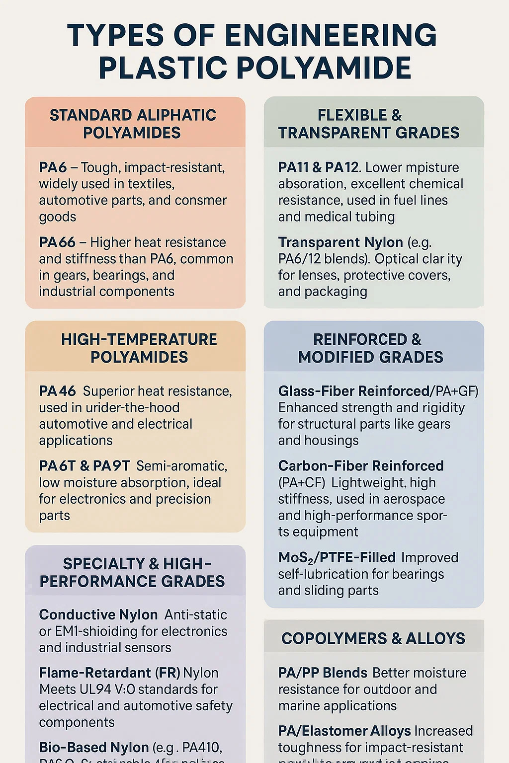 PA66 - korkeampi lämmönkestävyys ja jäykkyys kuin PA6, yleinen hammaspyörissä, laakereissa ja teollisuuskomponenteissa.
