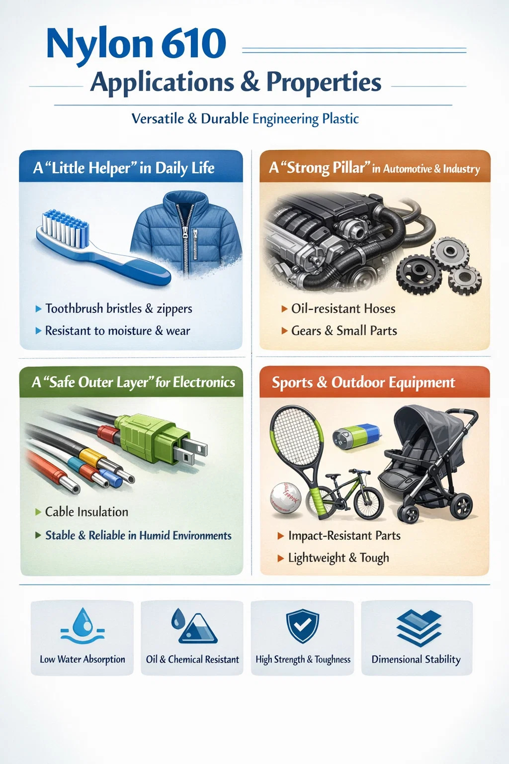 Harjat ja kuidut: Hammasharjasi harjakset ja vaatteiden vetoketjut ovat usein valmistettu Nylon 610:stä. Tavalliseen verrattuna Nylon 6 , se toimii paremmin kosteissa ympäristöissä, on vähemmän altis veden imeytymiselle ja muodonmuutoksille, ja harjakset säilyttävät kimmoisuutensa myös pitkäaikaisen käytön jälkeen, estäen niitä muuttumasta pehmeiksi ja velttoiksi.