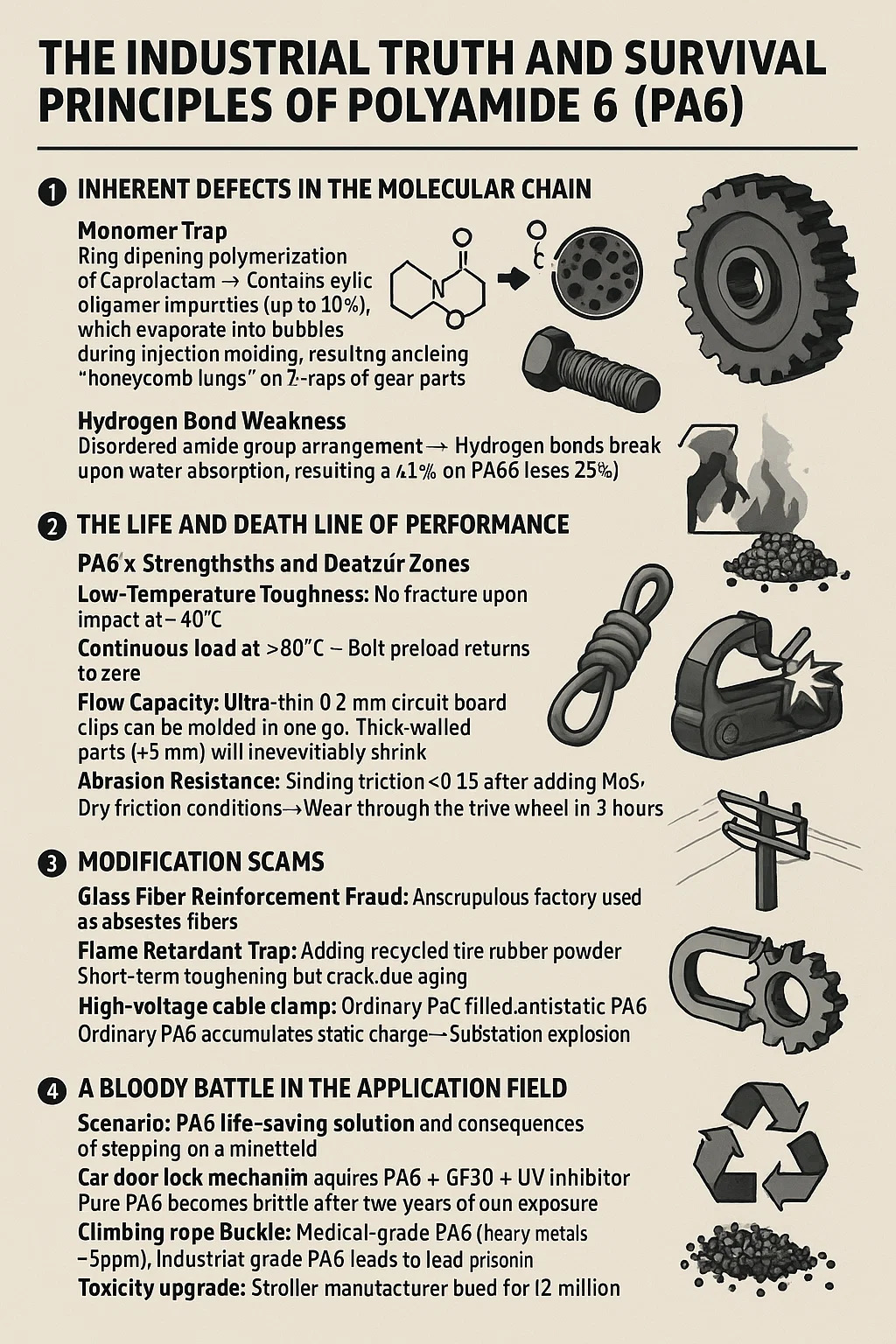 Monomeerien ansa: Kaprolaktaamin → Renkaan avautuva polymerointi sisältää syklisiä oligomeerien epäpuhtauksia (jopa 10%), jotka haihtuvat kupliksi injektiomuovan aikana, mikä johtaa "hunajakennon keuhkoihin" vaihdeosien röntgenkuviin.